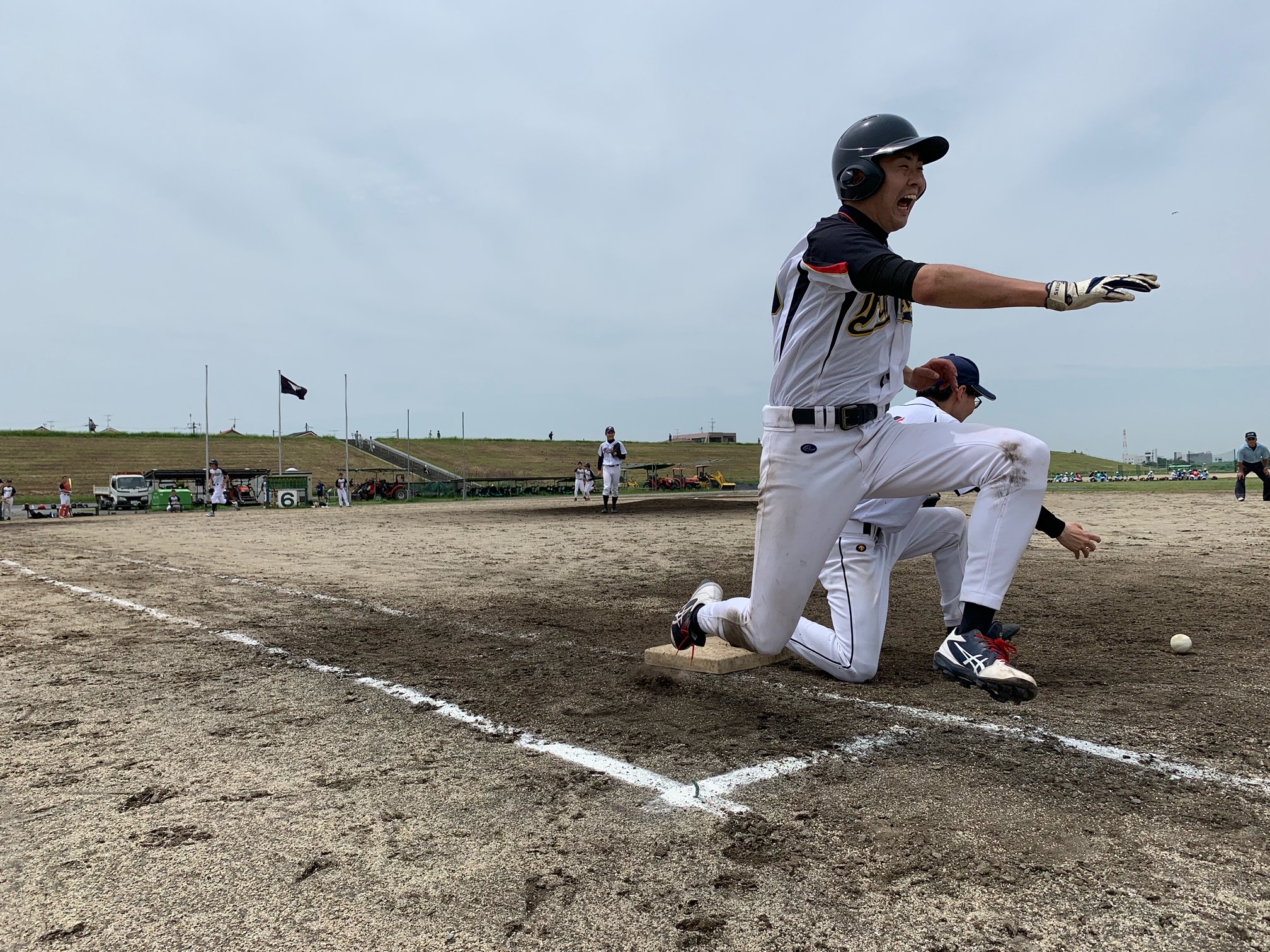 際どいタイミングで一塁を駆け抜けるファンキースのバッターランナー。